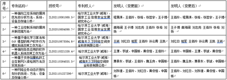 根据哈尔滨工业大学(威海)知识产权管理先关规定,涉及专利发明人或者设计人的专利变更,需进行公示。现对国家知识产权局已受理且在申请阶段的专利名称为“一种面向工控系统的漏洞优先级分析方法、系统、设备及存储介质”等6项专利的发明人变更情况予以公示,具体情况如下: