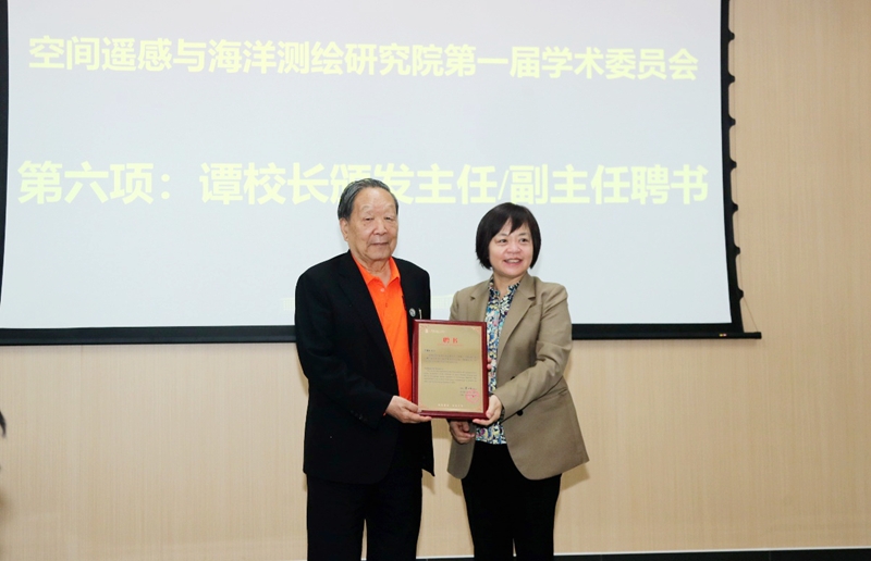 谭忆秋为空间遥感与海洋测绘研究院第一届学术委员会主任李德仁院士颁发聘书